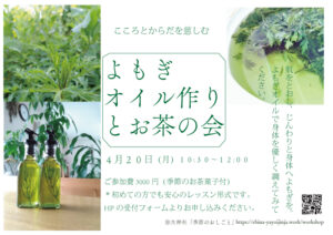 4月20日(月)節のおしごと」こころとからだを慈しむ 「よもぎオイル作りとお茶の会」